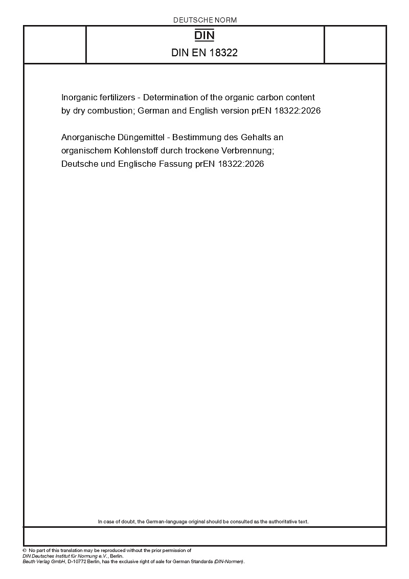 | Name: | Inorganic fertilizers - Determination of the organic carbon content by dry combustion; German and English version prEN 18322:2026 |