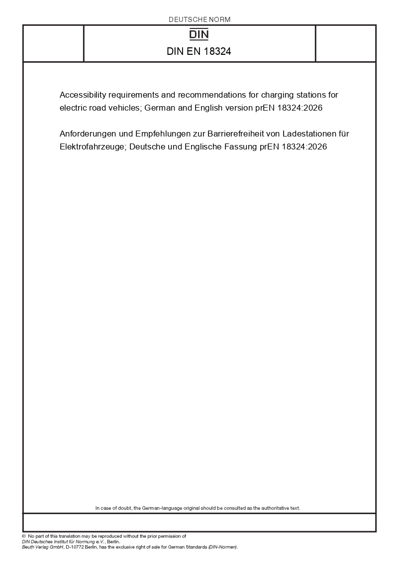| Name: | Accessibility requirements and recommendations for charging stations for electric road vehicles; German and English version prEN 18324:2026 |