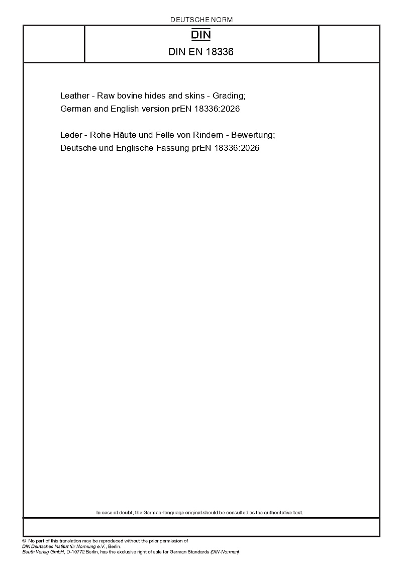 | Name: | Leather - Raw bovine hides and skins - Grading; German and English version prEN 18336:2026 |