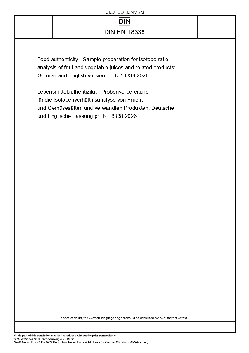 | Name: | Food authenticity - Sample preparation for isotope ratio analysis of fruit and vegetable juices and related products; German and English version prEN 18338:2026 |