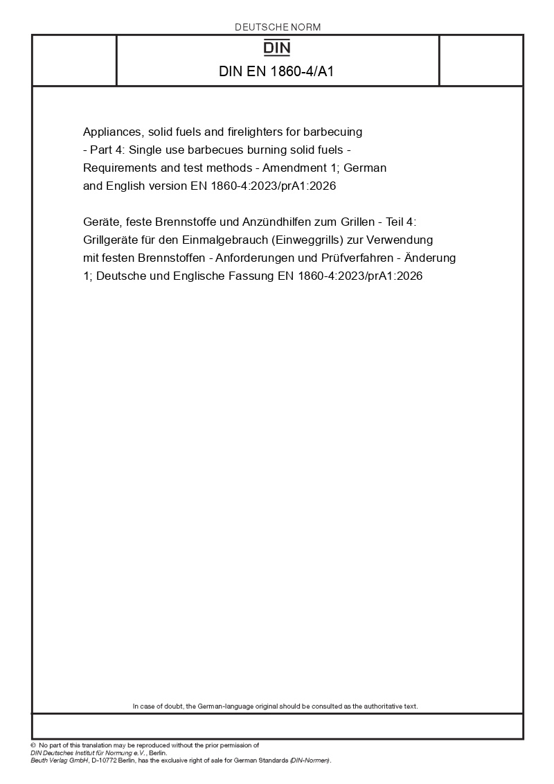 | Name: | Appliances, solid fuels and firelighters for barbecuing - Part 4: Single use barbecues burning solid fuels - Requirements and test methods - Amendment 1; German and English version EN 1860-4:2023/prA1:2026 |