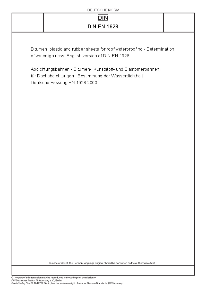 | Name: | Bitumen, plastic and rubber sheets for roof waterproofing - Determination of watertightness; English version of DIN EN 1928 |
