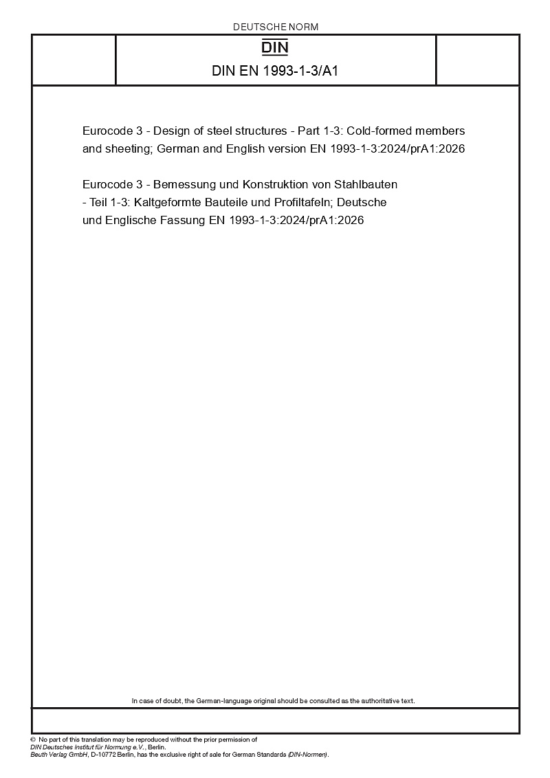 | Name: | Eurocode 3 - Design of steel structures - Part 1-3: Cold-formed members and sheeting; German and English version EN 1993-1-3:2024/prA1:2026 |