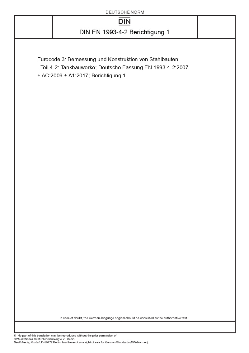 >DIN Standards>DIN EN 1993-4-2 Berichtigung 1 Eurocode 3: Bemessung und Konstruktion von Stahlbauten - Teil 4-2: Tankbauwerke; Deutsche Fassung EN 1993-4-2:2007 + AC:2009 + A1:2017; Berichtigung 1