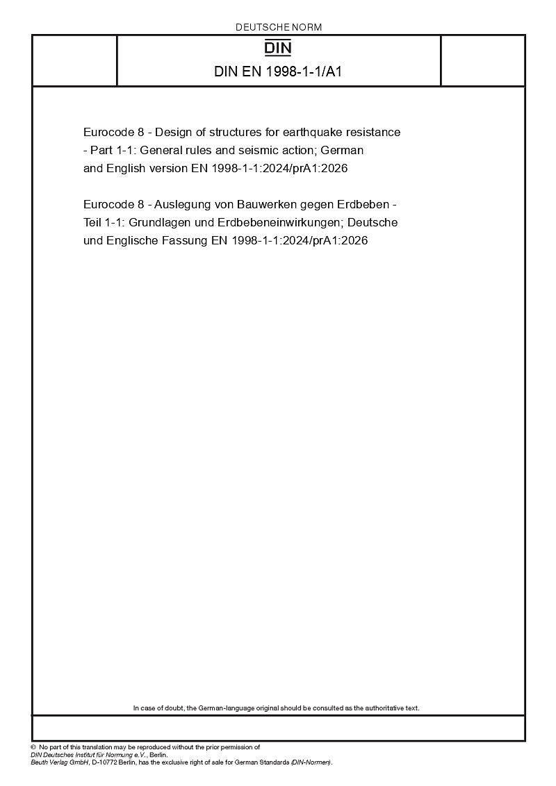 | Name: | Eurocode 8 - Design of structures for earthquake resistance - Part 1-1: General rules and seismic action; German and English version EN 1998-1-1:2024/prA1:2026 |