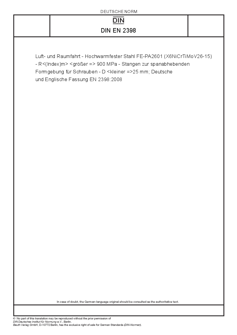 Luft- und Raumfahrt - Hochwarmfester Stahl FE-PA2601 (X6NiCrTiMoV26-15) - R<(Index)m> ≥ 900 MPa - Stangen zur spanabhebenden Formgebung für Schrauben - D ≤25 mm; Deutsche und Englische Fassung EN 2398:2008
