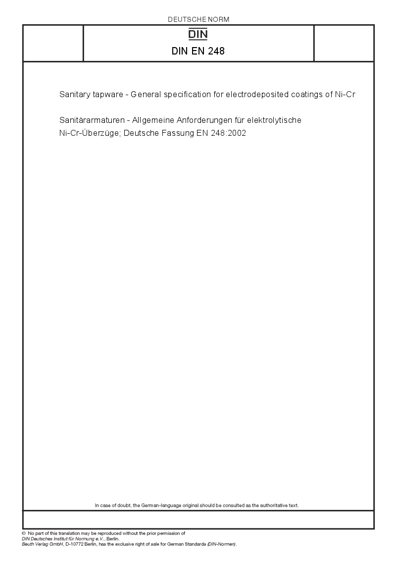 Sanitärarmaturen - Allgemeine Anforderungen für elektrolytische Ni-Cr-Überzüge; Deutsche Fassung EN 248:2002