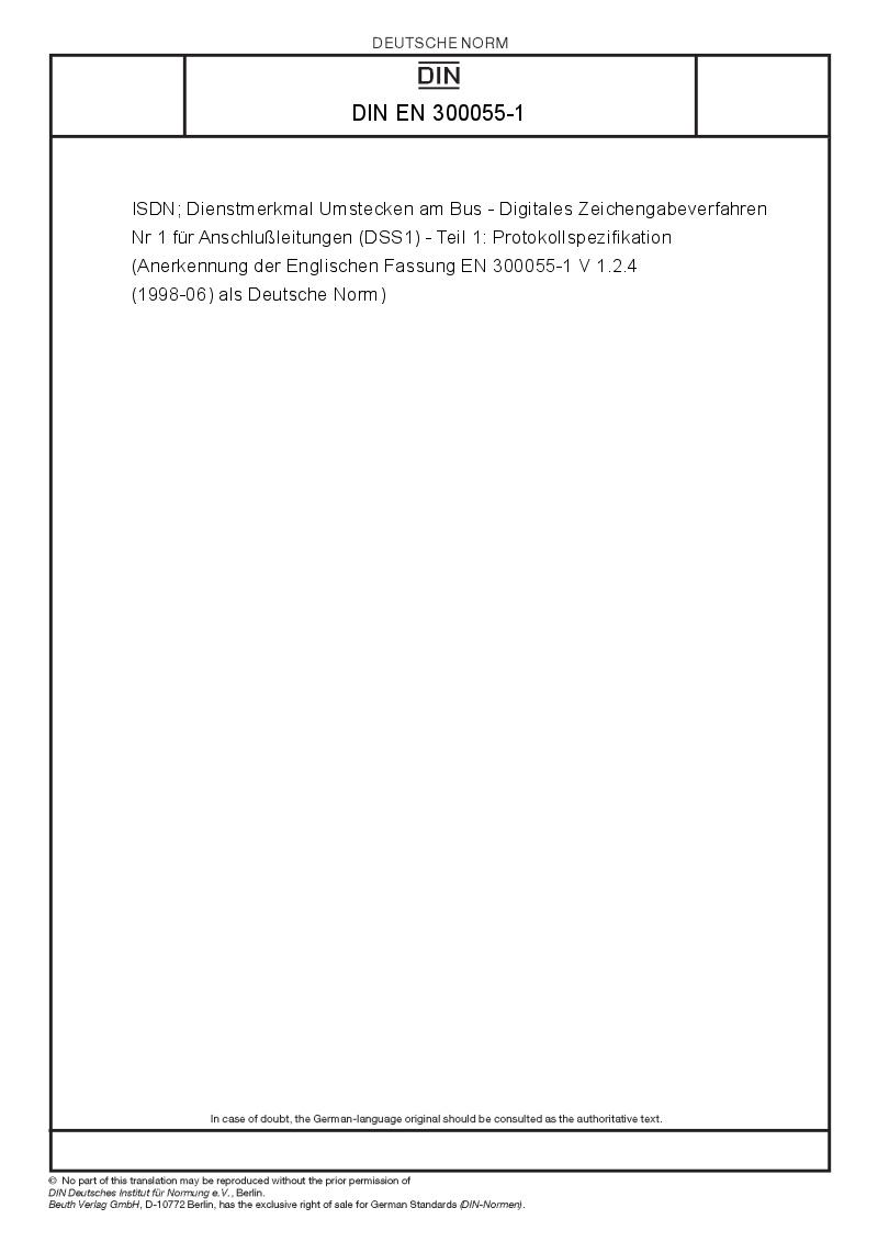 | Name: | ISDN; Dienstmerkmal Umstecken am Bus - Digitales Zeichengabeverfahren Nr 1 für Anschlußleitungen (DSS1) - Teil 1: Protokollspezifikation (Anerkennung der Englischen Fassung EN 300055-1 V 1.2.4 (1998-06) als Deutsche Norm) |