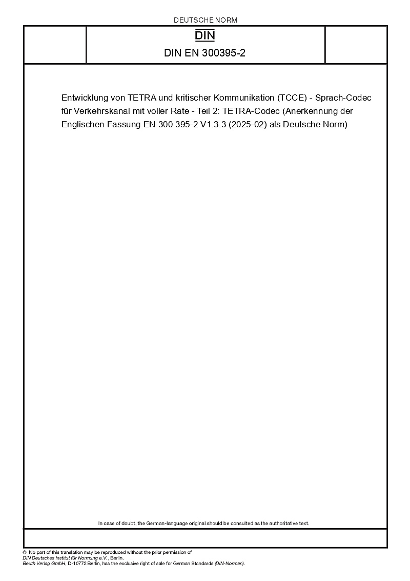 | Name: | Entwicklung von TETRA und kritischer Kommunikation (TCCE) - Sprach-Codec für Verkehrskanal mit voller Rate - Teil 2: TETRA-Codec (Anerkennung der Englischen Fassung EN 300 395-2 V1.3.3 (2025-02) als Deutsche Norm) |