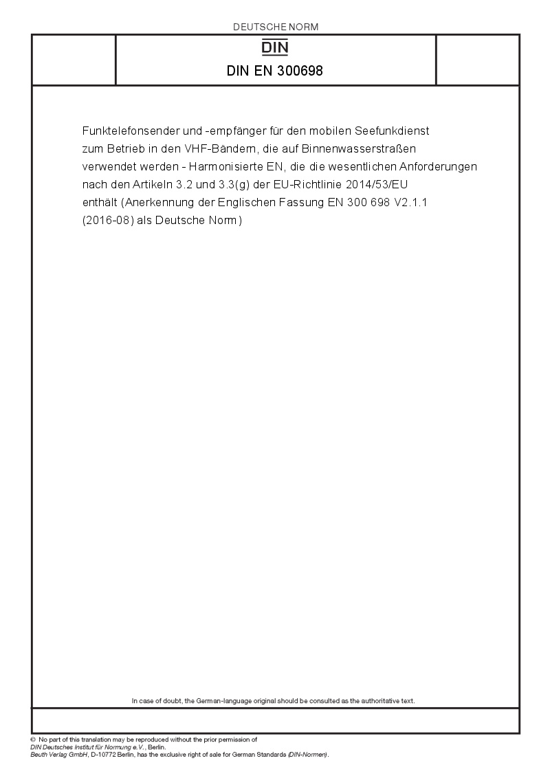| Name: | Funktelefonsender und -empfänger für den mobilen Seefunkdienst in den VHF-Bändern für den Einsatz auf Binnenwasserstraßen - Harmonisierte Norm für den Zugang zum Funkspektrum und für Funktionen für Rettungsdienste (Anerkennung der Englischen Fassung EN 300 698 V2.3.1 (2018-11) als Deutsche Norm) |