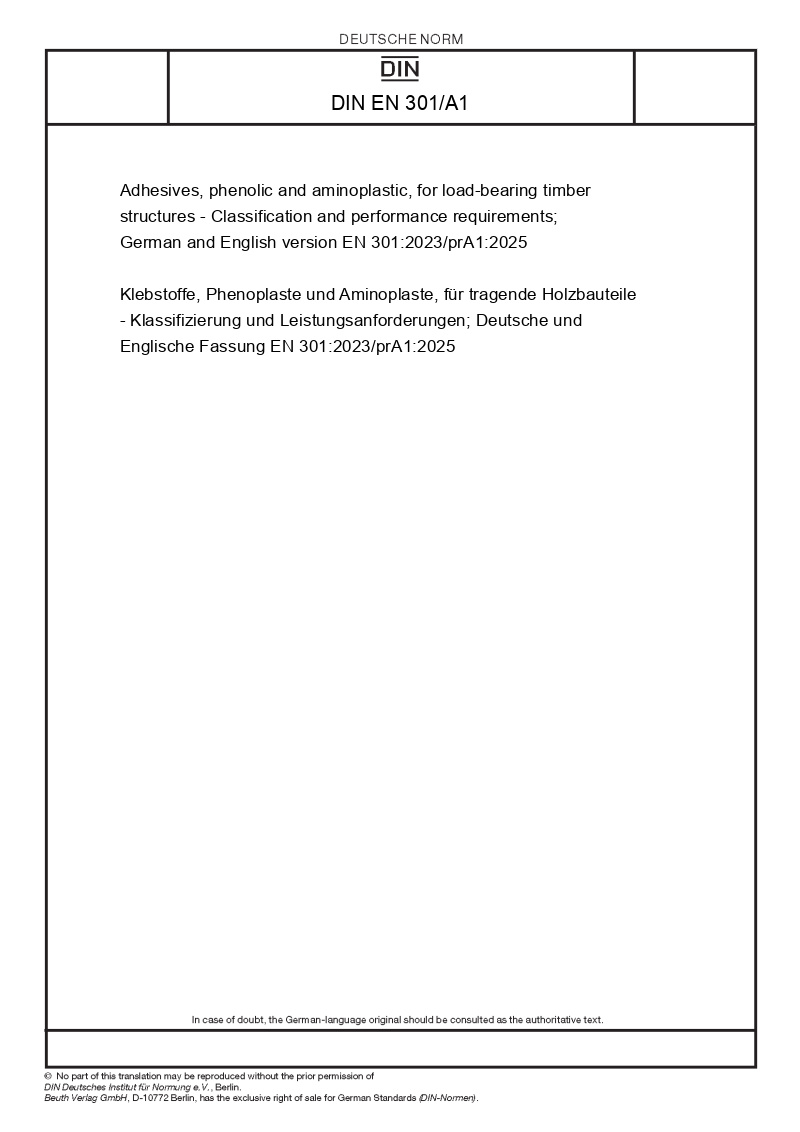 Name: | Adhesives, phenolic and aminoplastic, for load-bearing timber structures - Classification and performance requirements; German and English version EN 301:2023/prA1:2025 |