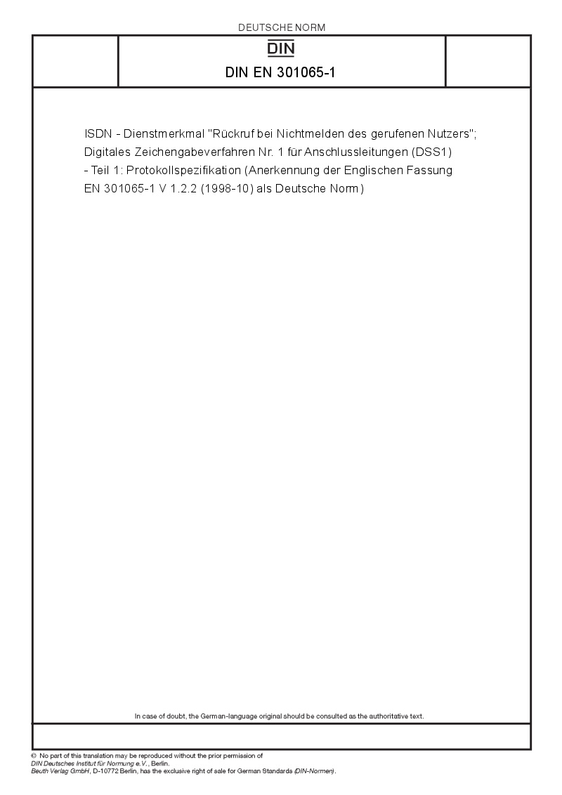 ISDN - Dienstmerkmal "Rückruf bei Nichtmelden des gerufenen Nutzers"; Digitales Zeichengabeverfahren Nr. 1 für Anschlussleitungen (DSS1) - Teil 1: Protokollspezifikation (Anerkennung der Englischen Fassung EN 301065-1 V 1.2.2 (1998-10) als Deutsche Norm)