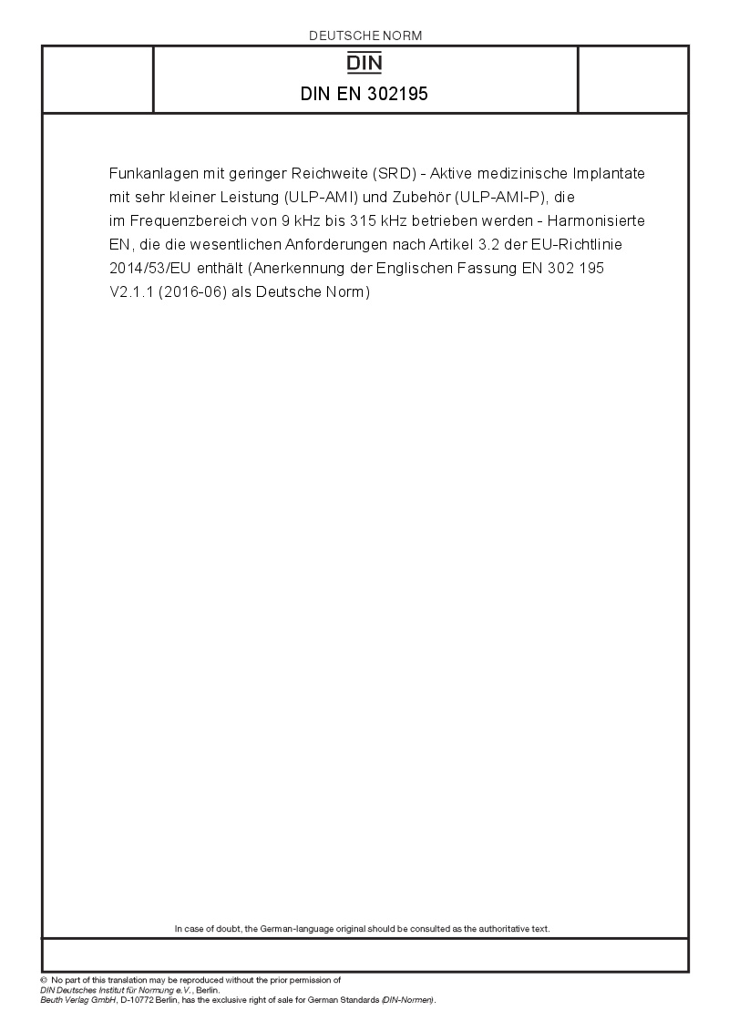 Funkanlagen mit geringer Reichweite (SRD) - Aktive medizinische Implantate mit sehr kleiner Leistung (ULP-AMI) und Zubehör (ULP-AMI-P), die im Frequenzbereich von 9 kHz bis 315 kHz betrieben werden - Harmonisierte EN, die die wesentlichen Anforderungen nach Artikel 3.2 der EU-Richtlinie 2014/53/EU enthält (Anerkennung der Englischen Fassung EN 302 195 V2.1.1 (2016-06) als Deutsche Norm)