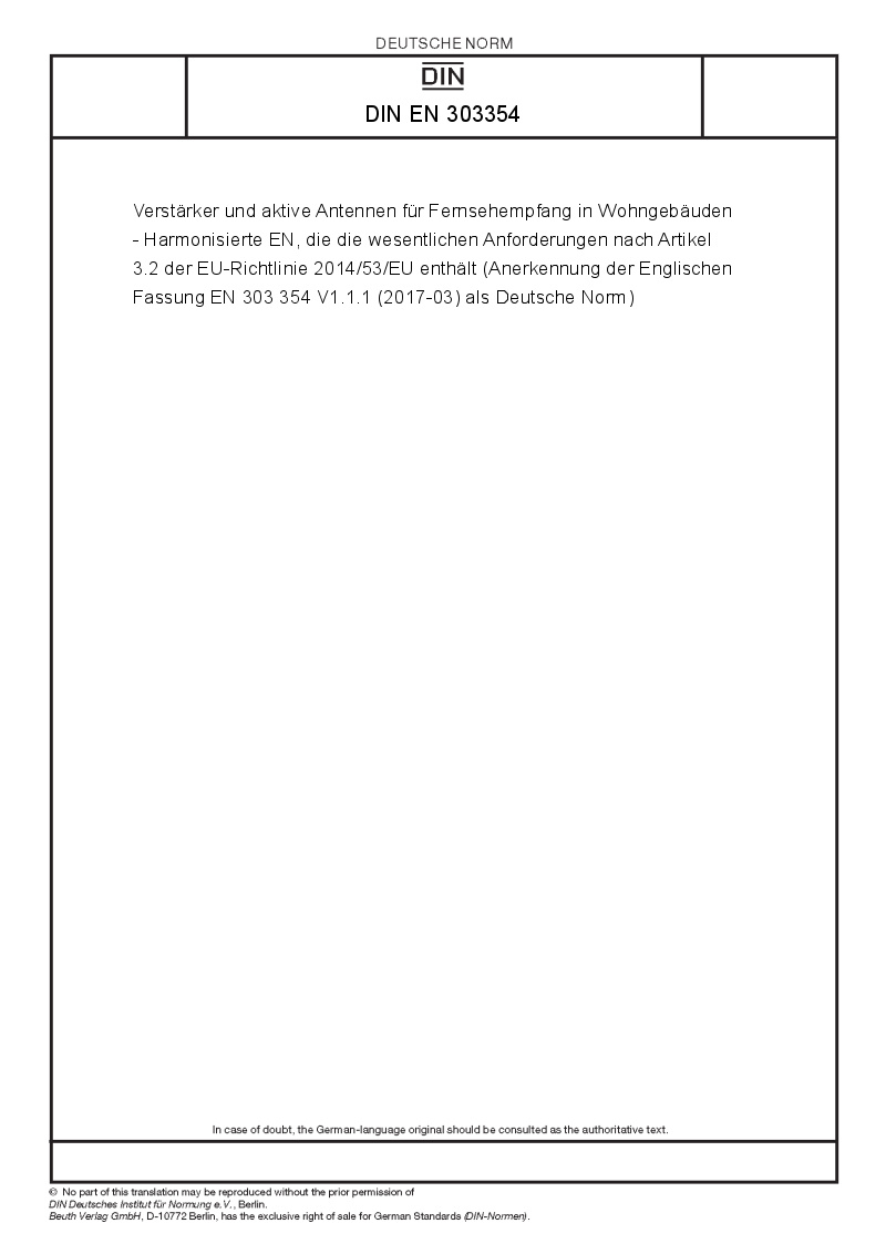 Verstärker und aktive Antennen für Fernsehempfang in Wohngebäuden - Harmonisierte EN, die die wesentlichen Anforderungen nach Artikel 3.2 der EU-Richtlinie 2014/53/EU enthält (Anerkennung der Englischen Fassung EN 303 354 V1.1.1 (2017-03) als Deutsche Norm)