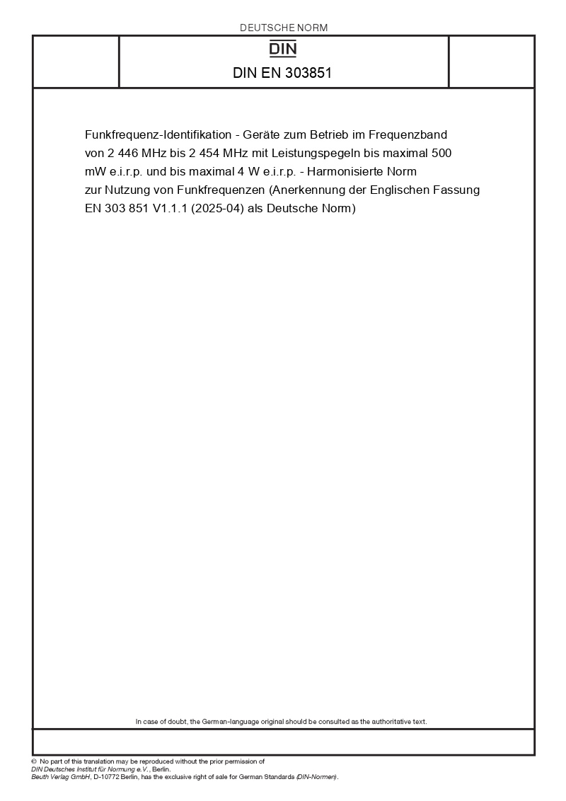 | Name: | Funkfrequenz-Identifikation - Geräte zum Betrieb im Frequenzband von 2 446 MHz bis 2 454 MHz mit Leistungspegeln bis maximal 500 mW e.i.r.p. und bis maximal 4 W e.i.r.p. - Harmonisierte Norm zur Nutzung von Funkfrequenzen (Anerkennung der Englischen Fassung EN 303 851 V1.1.1 (2025-04) als Deutsche Norm) |