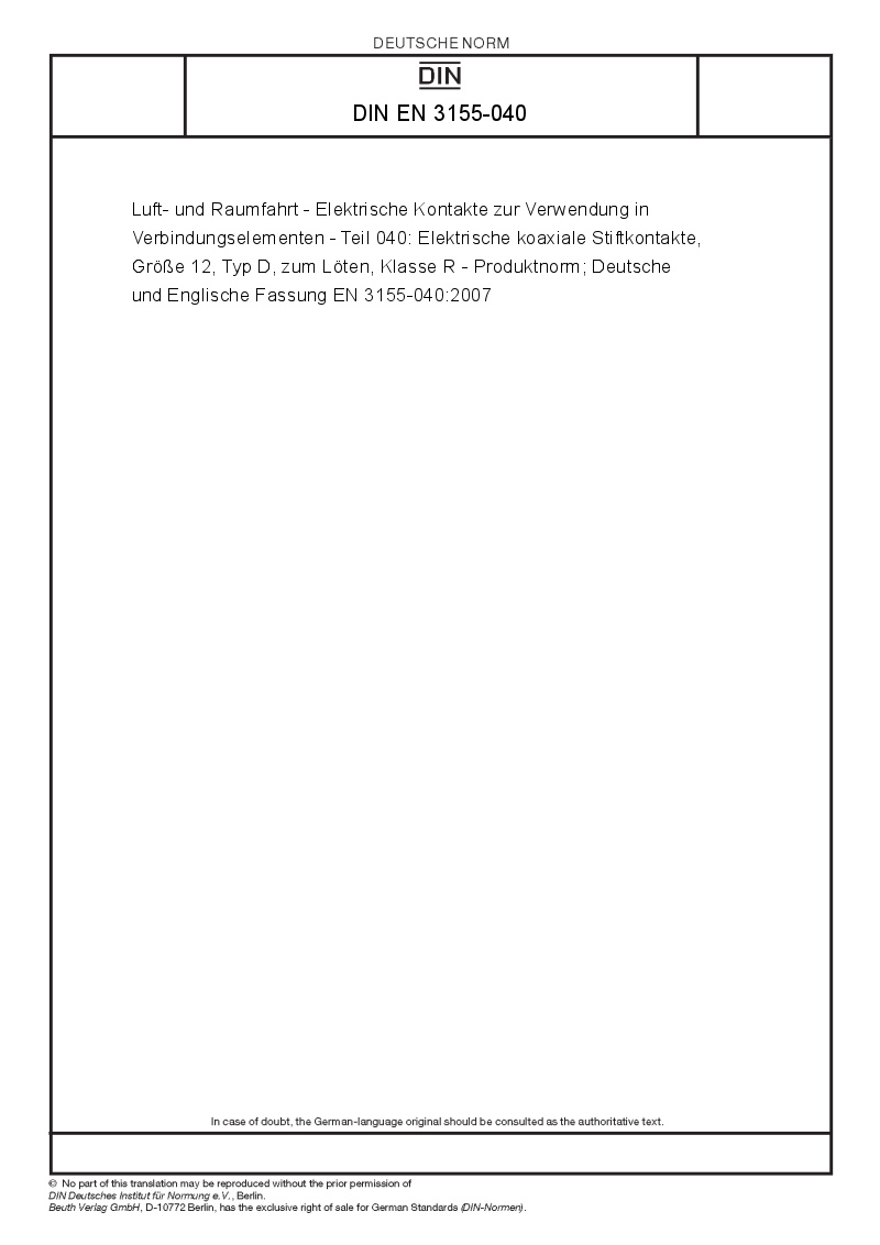 Luft- und Raumfahrt - Elektrische Kontakte zur Verwendung in Verbindungselementen - Teil 040: Elektrische koaxiale Stiftkontakte, Größe 12, Typ D, zum Löten, Klasse R - Produktnorm; Deutsche und Englische Fassung EN 3155-040:2007
