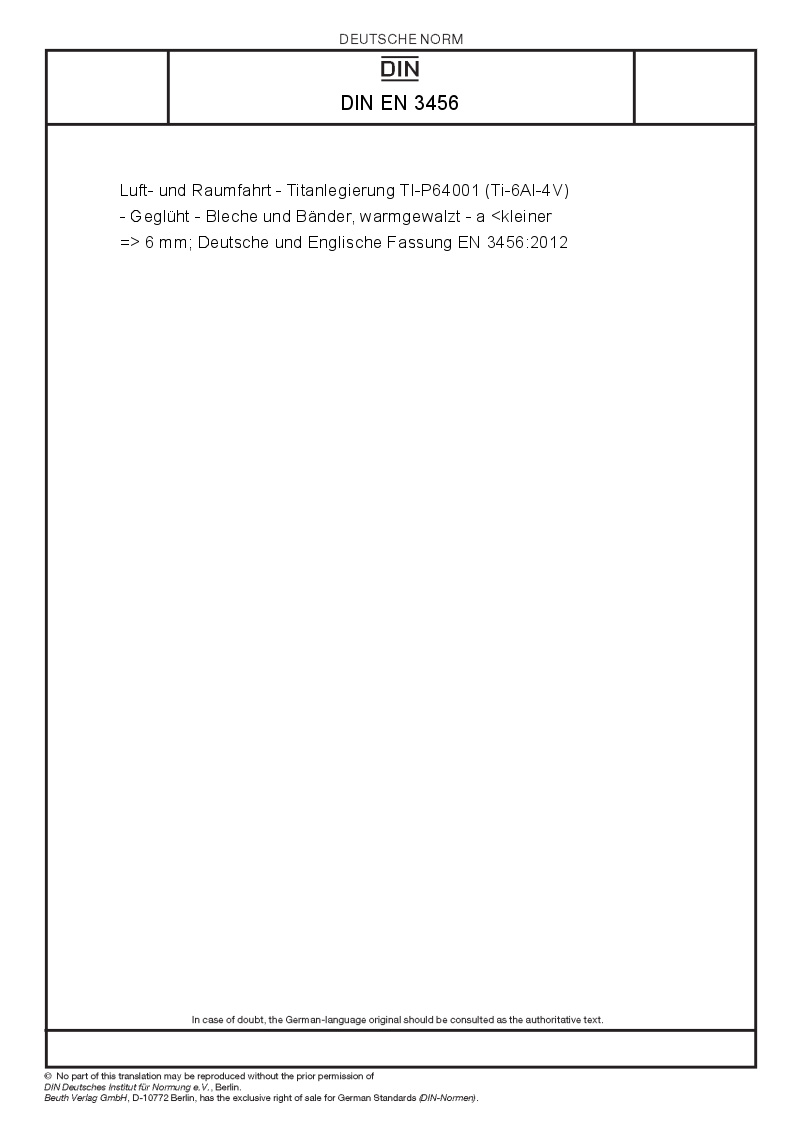 | Name: | Aerospace series - Titanium alloy TI-P64001 (Ti-6Al-4V) - Annealed - Sheet and strip, hot rolled - a ≤ 6 mm; German and English version EN 3456:2012 |
