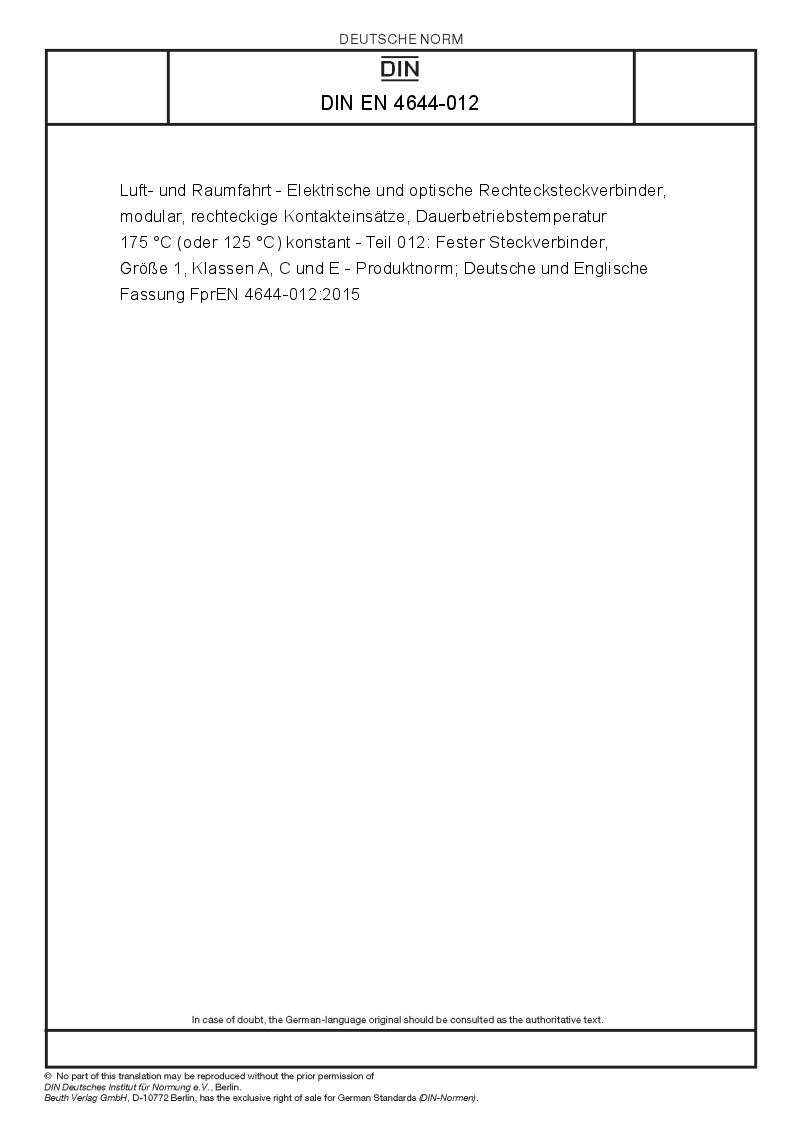 Luft- und Raumfahrt - Elektrische und optische Rechtecksteckverbinder, modular, rechteckige Kontakteinsätze, Dauerbetriebstemperatur 175 °C (oder 125 °C) konstant - Teil 012: Fester Steckverbinder, Größe 1, Klassen A, C und E - Produktnorm; Deutsche und Englische Fassung EN 4644-012:2015