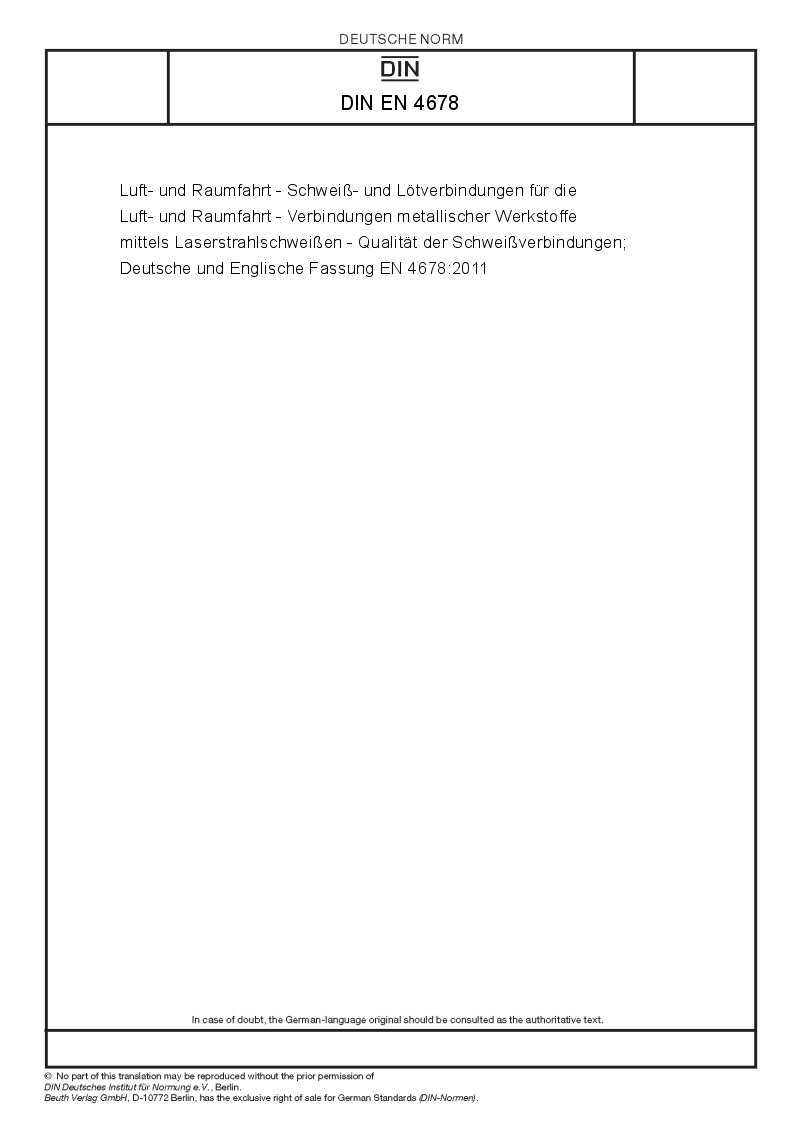 | Name: | Aerospace series - Weldments and brazements for aerospace structures - Joints of metallic materials by laser beam welding - Quality of weldments; German and English version EN 4678:2011 |