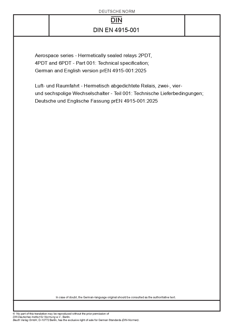 Aerospace series - Hermetically sealed relays 2PDT, 4PDT and 6PDT - Part 001: Technical specification; German and English version prEN 4915-001:2025