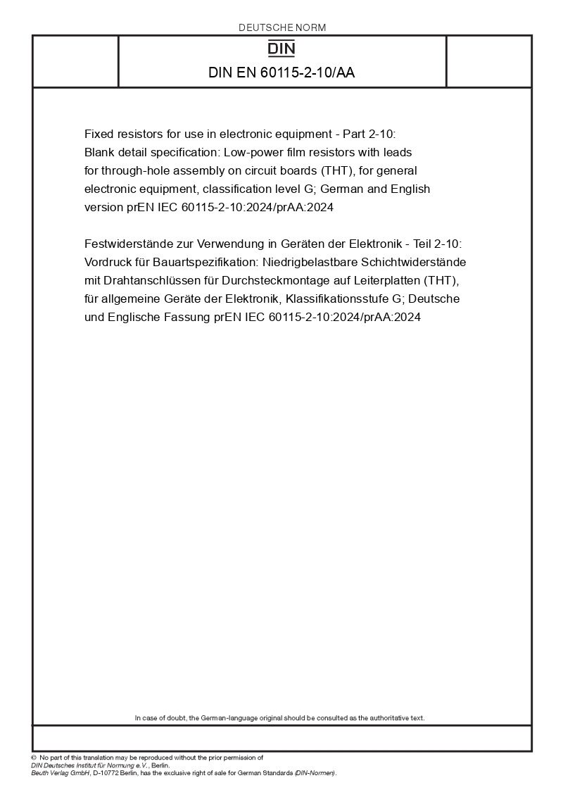 Fixed resistors for use in electronic equipment - Part 2-10: Blank detail specification: Low-power film resistors with leads for through-hole assembly on circuit boards (THT), for general electronic equipment, classification level G; German and English version prEN IEC 60115-2-10:2024/prAA:2024