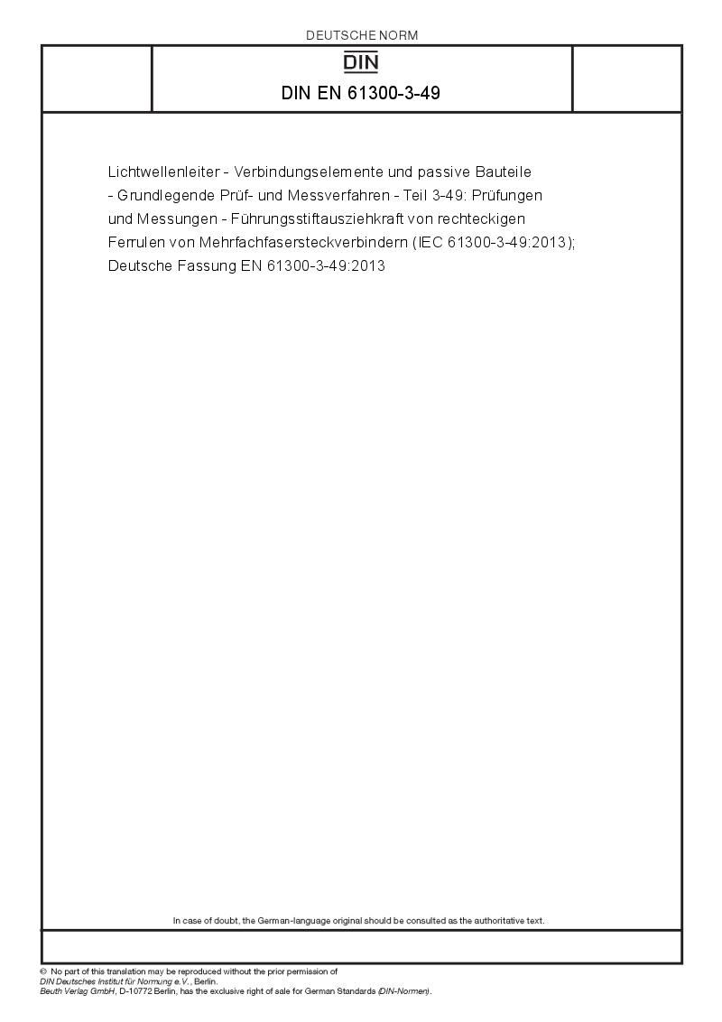 | Name: | Lichtwellenleiter - Verbindungselemente und passive Bauteile - Grundlegende Prüf- und Messverfahren - Teil 3-49: Prüfungen und Messungen - Führungsstiftausziehkraft von rechteckigen Ferrulen von Mehrfachfasersteckverbindern (IEC 61300-3-49:2013); Deutsche Fassung EN 61300-3-49:2013 |