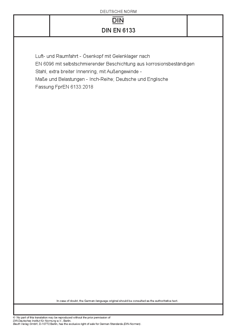 | Name: | Aerospace series - Rod-end, with bearing per EN 6096, with self-lubricating liner in corrosion resisting steel, extra wide inner ring, external threaded shank - Dimensions and loads - Inch series; German and English version EN 6133:2019 |