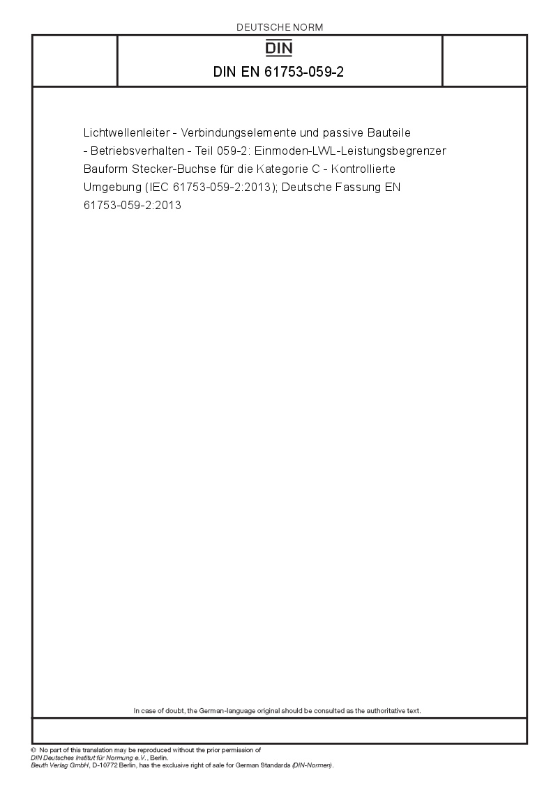 Lichtwellenleiter - Verbindungselemente und passive Bauteile - Betriebsverhalten - Teil 059-2: Einmoden-LWL-Leistungsbegrenzer Bauform Stecker-Buchse für die Kategorie C - Kontrollierte Umgebung (IEC 61753-059-2:2013); Deutsche Fassung EN 61753-059-2:2013