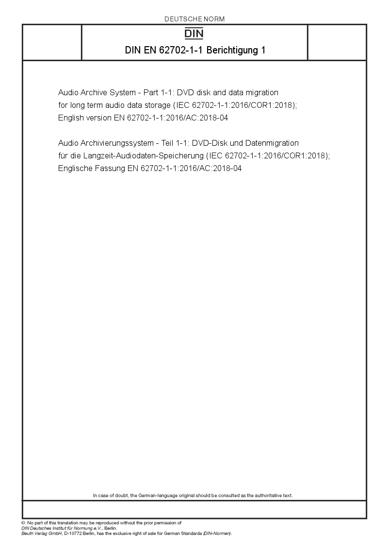 Audio Archive System - Part 1-1: DVD disk and data migration for long term audio data storage (IEC 62702-1-1:2016/COR1:2018); English version EN 62702-1-1:2016/AC:2018-04