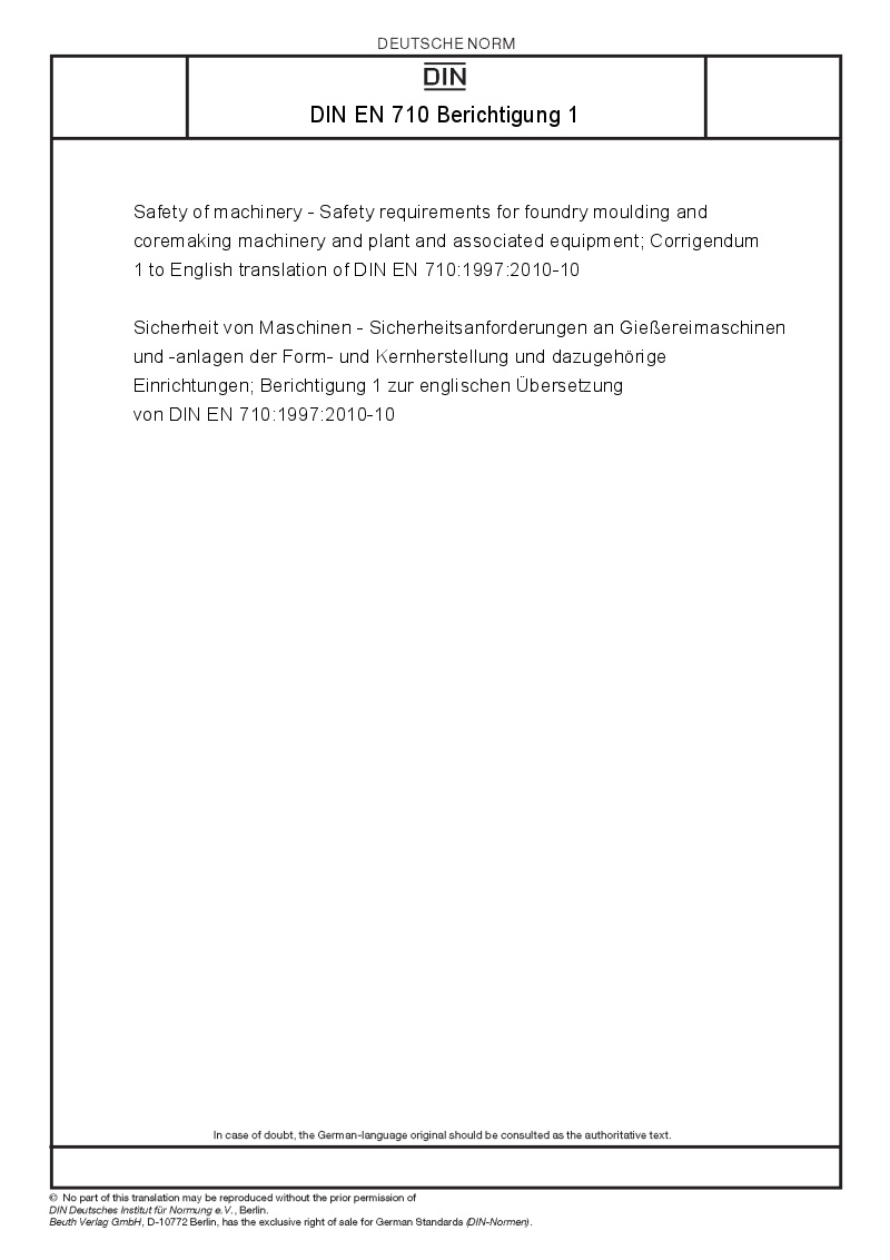 >DIN Standards>DIN EN 710 Berichtigung 1 Safety of machinery - Safety requirements for foundry moulding and coremaking machinery and plant and associated equipment; Corrigendum 1 to English translation of DIN EN 710:1997:2010-10