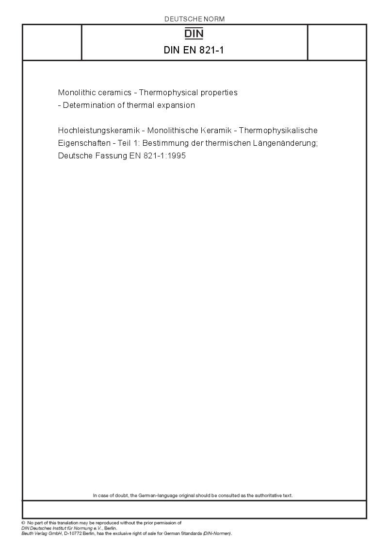 >DIN Standards>DIN EN 821-1 Monolithic ceramics - Thermophysical properties - Determination of thermal expansion