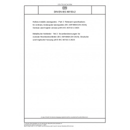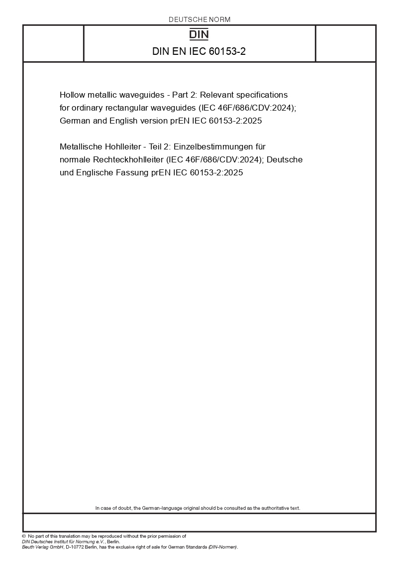 | Name: | Hollow metallic waveguides - Part 2: Relevant specifications for ordinary rectangular waveguides (IEC 46F/686/CDV:2024); German and English version prEN IEC 60153-2:2025 |