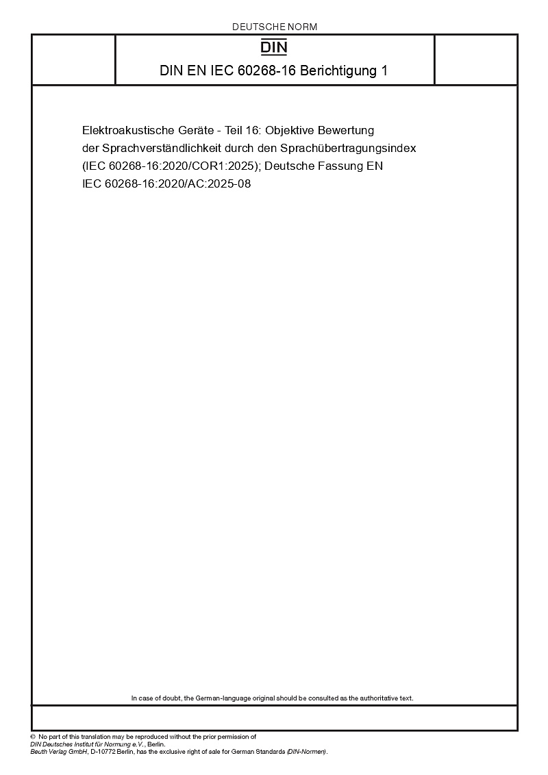 | Name: | Elektroakustische Geräte - Teil 16: Objektive Bewertung der Sprachverständlichkeit durch den Sprachübertragungsindex (IEC 60268-16:2020/COR1:2025); Deutsche Fassung EN IEC 60268-16:2020/AC:2025-08 |