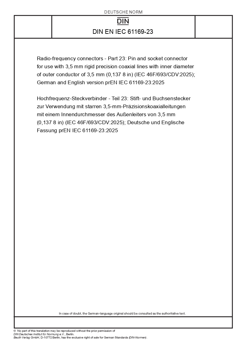 | Name: | Radio-frequency connectors - Part 23: Pin and socket connector for use with 3,5 mm rigid precision coaxial lines with inner diameter of outer conductor of 3,5 mm (0,137 8 in) (IEC 46F/693/CDV:2025); German and English version prEN IEC 61169-23:2025 |