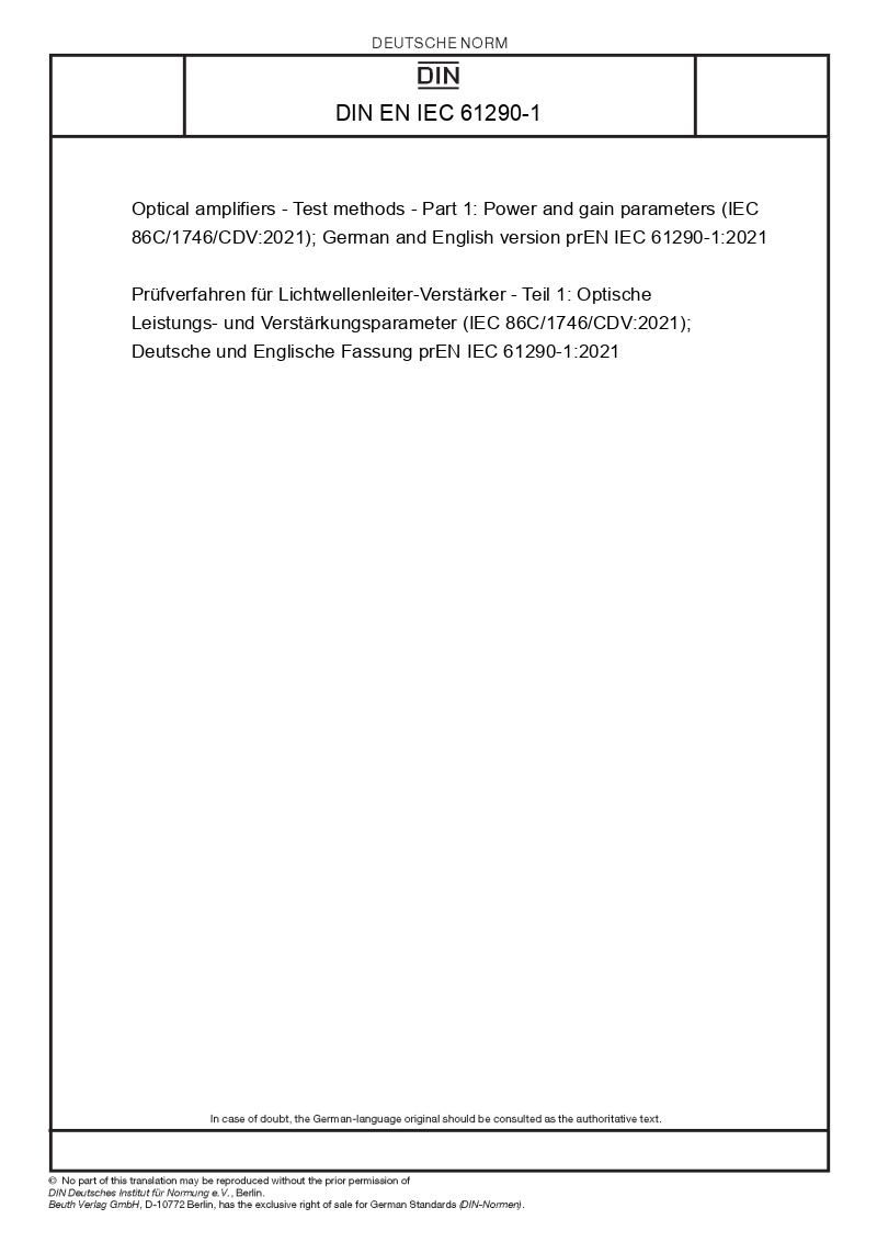 >DIN Standards>DIN EN IEC 61290-1 Prüfverfahren für Lichtwellenleiter-Verstärker - Teil 1: Optische Leistungs- und Verstärkungsparameter (IEC 61290-1:2022); Deutsche Fassung EN IEC 61290-1:2022