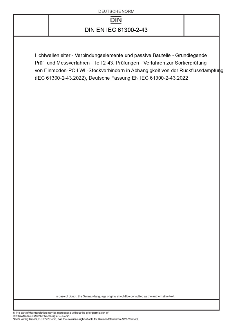 | Name: | Lichtwellenleiter - Verbindungselemente und passive Bauteile - Grundlegende Prüf- und Messverfahren - Teil 2-43: Prüfungen - Verfahren zur Sortierprüfung von Einmoden-PC-LWL-Steckverbindern in Abhängigkeit von der Rückflussdämpfung (IEC 61300-2-43:2022); Deutsche Fassung EN IEC 61300-2-43:2022 |