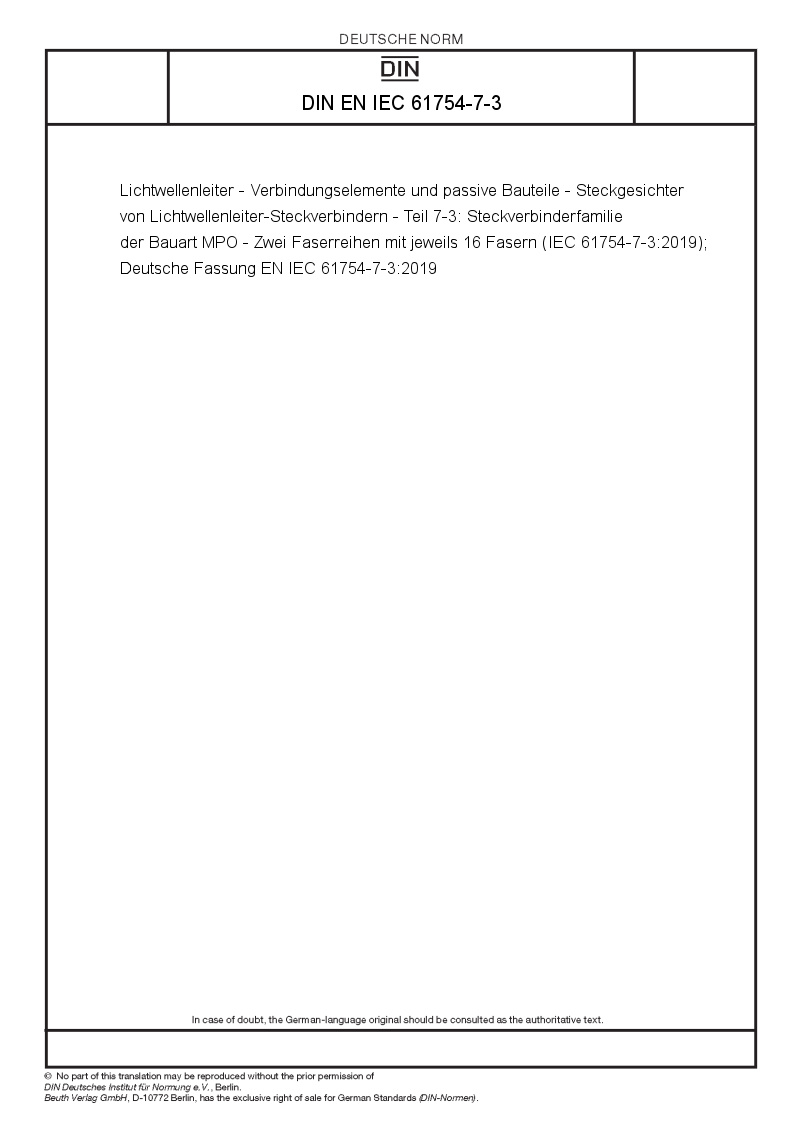 | Name: | Lichtwellenleiter - Verbindungselemente und passive Bauteile - Steckgesichter von Lichtwellenleiter-Steckverbindern - Teil 7-3: Steckverbinderfamilie der Bauart MPO - Zwei Faserreihen mit jeweils 16 Fasern (IEC 61754-7-3:2019); Deutsche Fassung EN IEC 61754-7-3:2019 |