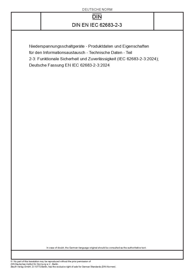 | Name: | Niederspannungsschaltgeräte - Produktdaten und Eigenschaften für den Informationsaustausch - Technische Daten - Teil 2-3: Funktionale Sicherheit und Zuverlässigkeit (IEC 62683-2-3:2024); Deutsche Fassung EN IEC 62683-2-3:2024 |