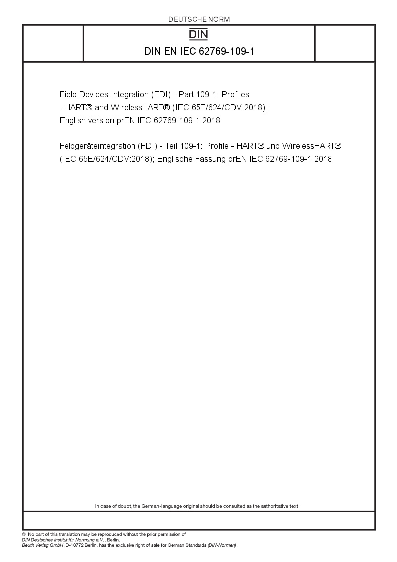 | Name: | Field devices integration (FDI) - Part 109-1: Profiles - HART® and WirelessHART® (IEC 62769-109-1:2020); English version EN IEC 62769-109-1:2020 |