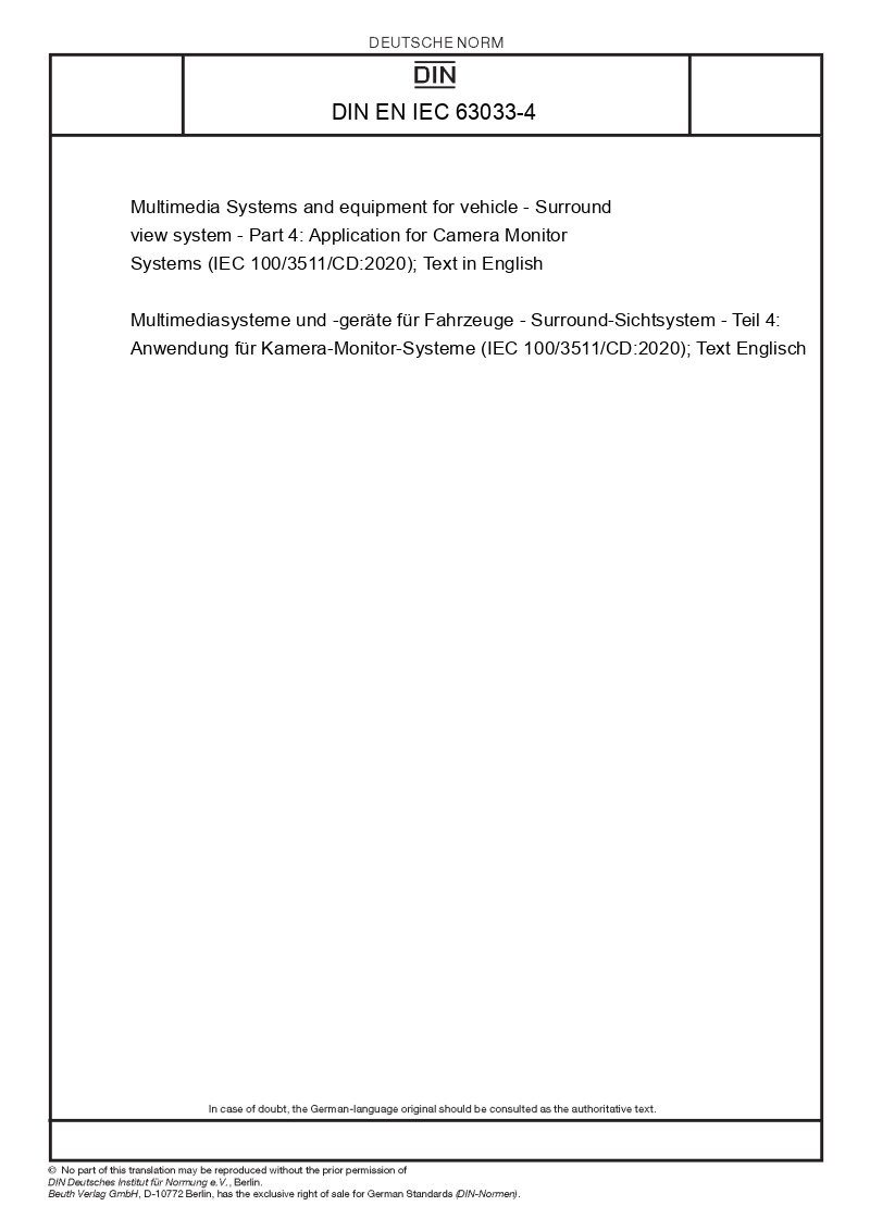 >DIN Standards>DIN EN IEC 63033-4 Multimedia Systeme und Einrichtungen für Fahrzeuge - Rundumsicht-System - Teil 4: Anwendung für Kamera-Überwachungssysteme (IEC 63033-4:2022); Deutsche Fassung EN IEC 63033-4:2022