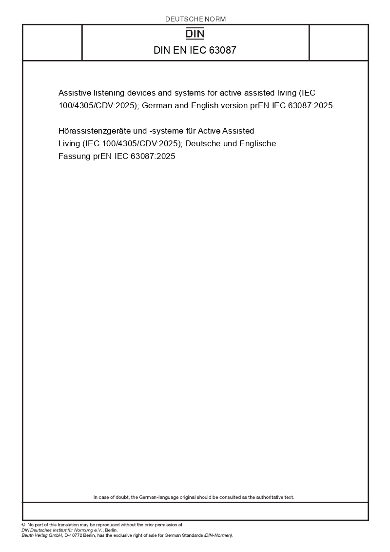 | Name: | Assistive listening devices and systems for active assisted living (IEC 100/4305/CDV:2025); German and English version prEN IEC 63087:2025 |