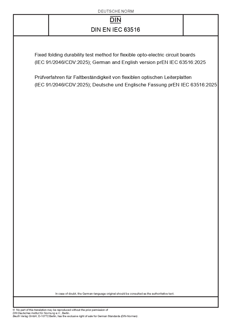 | Name: | Fixed folding durability test method for flexible opto-electric circuit boards (IEC 91/2046/CDV:2025); German and English version prEN IEC 63516:2025 |