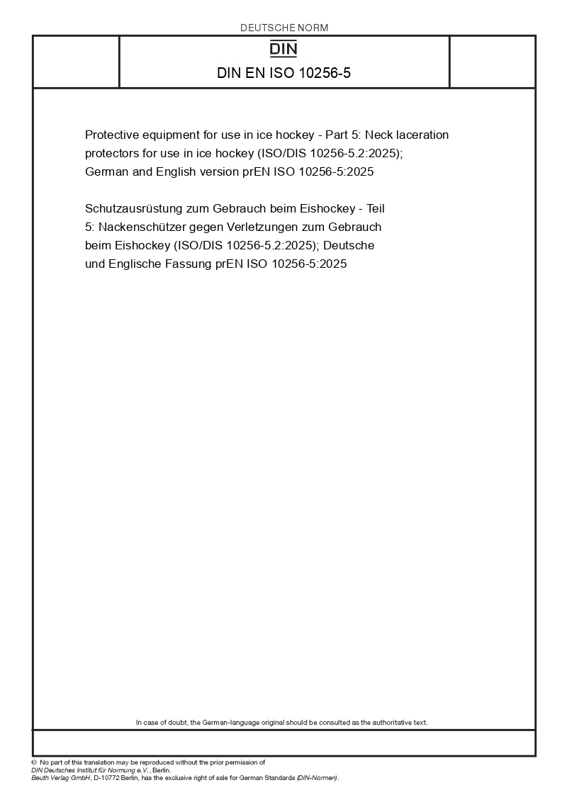 | Name: | Protective equipment for use in ice hockey - Part 5: Neck laceration protectors for use in ice hockey (ISO/DIS 10256-5.2:2025); German and English version prEN ISO 10256-5:2025 |