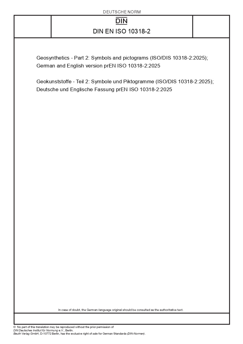 | Name: | Geosynthetics - Part 2: Symbols and pictograms (ISO/DIS 10318-2:2025); German and English version prEN ISO 10318-2:2025 |