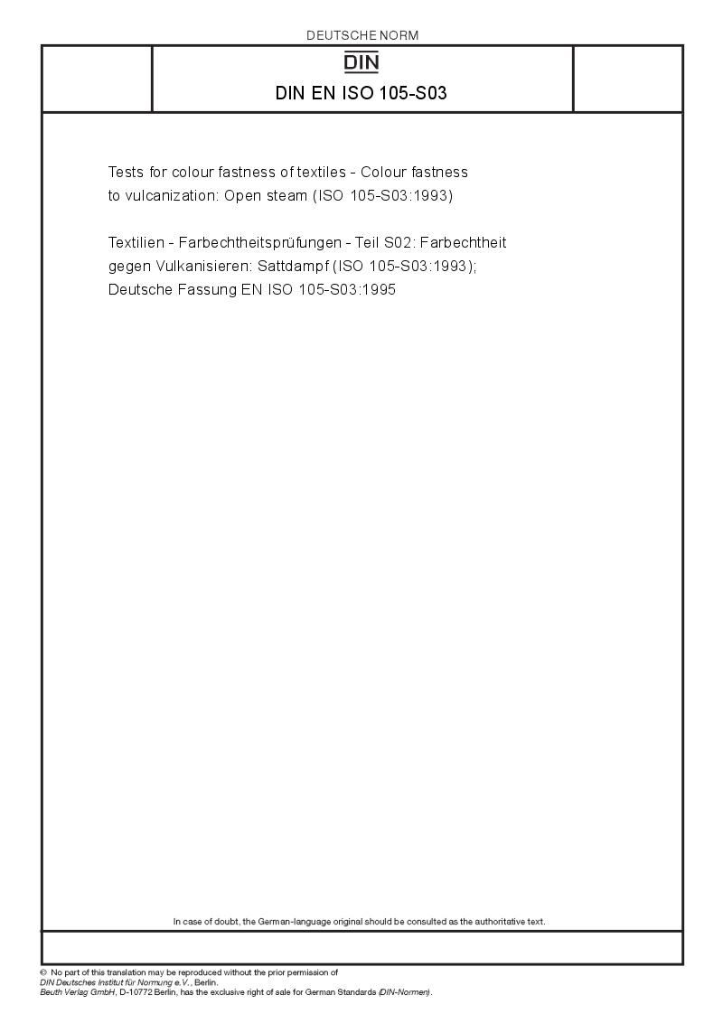 | Name: | Tests for colour fastness of textiles - Colour fastness to vulcanization: Open steam (ISO 105-S03:1993) |