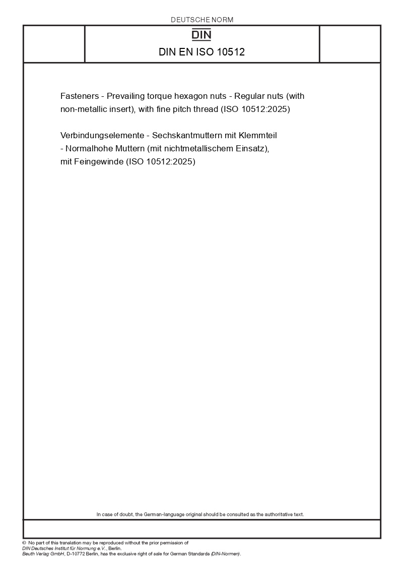 Name: | Fasteners - Prevailing torque hexagon nuts - Regular nuts (with non-metallic insert), with fine pitch thread (ISO 10512:2025) |