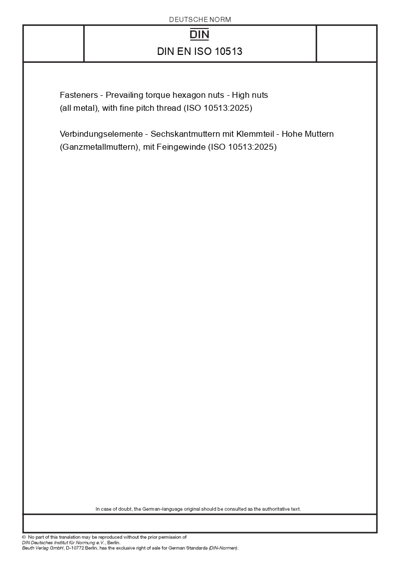 Name: | Fasteners - Prevailing torque hexagon nuts - High nuts (all metal), with fine pitch thread (ISO 10513:2025) |