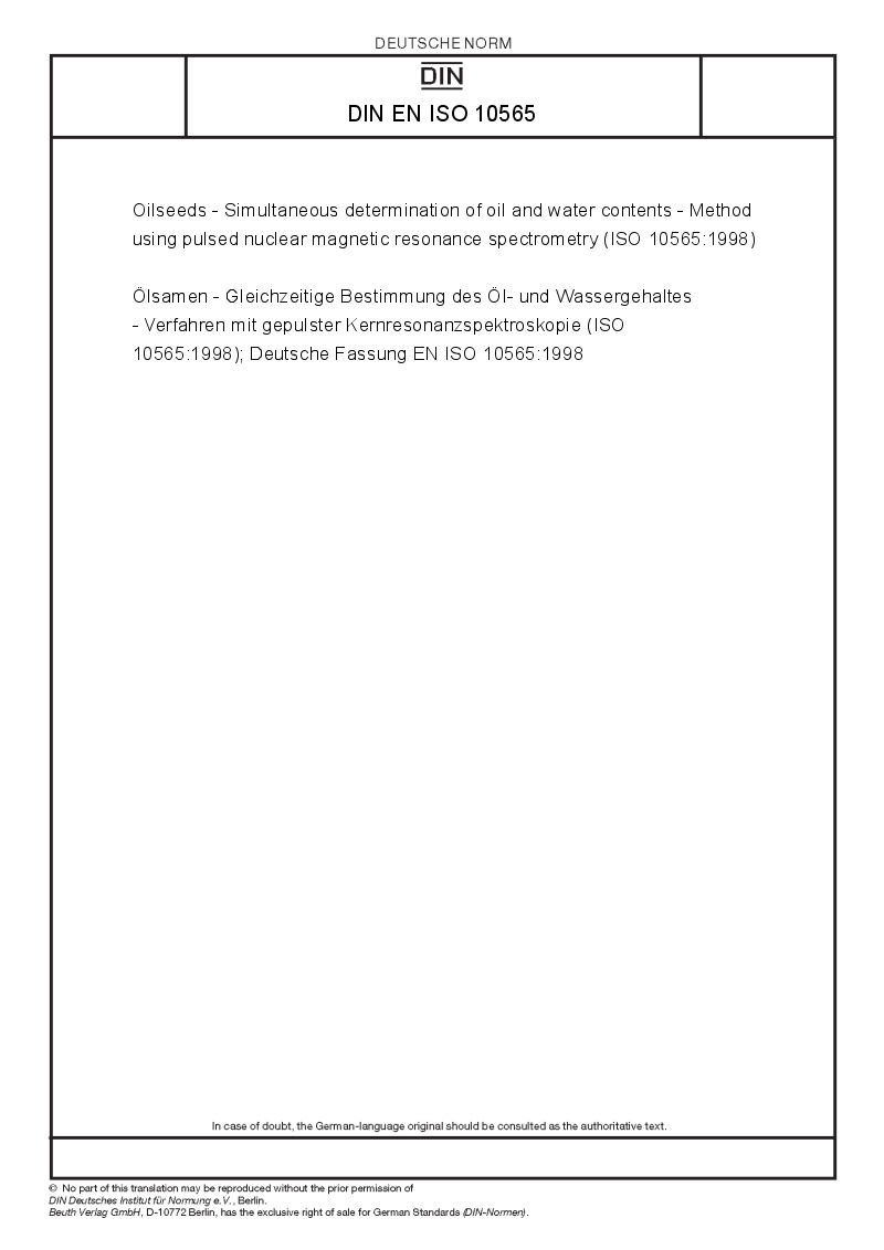 Ölsamen - Gleichzeitige Bestimmung des Öl- und Wassergehaltes - Verfahren mit gepulster Kernresonanzspektroskopie (ISO 10565:1998); Deutsche Fassung EN ISO 10565:1998