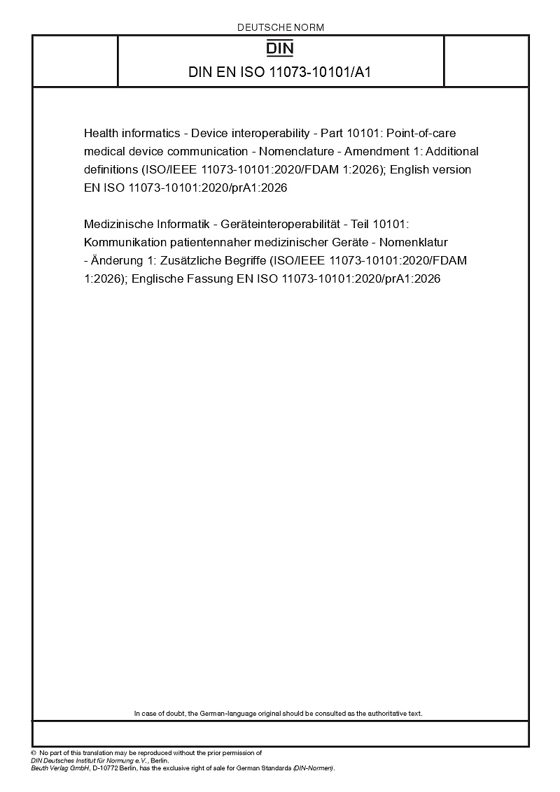 | Name: | Health informatics - Device interoperability - Part 10101: Point-of-care medical device communication - Nomenclature - Amendment 1: Additional definitions (ISO/IEEE 11073-10101:2020/FDAM 1:2026); English version EN ISO 11073-10101:2020/prA1:2026 |