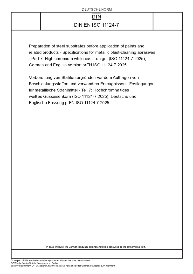 | Name: | Preparation of steel substrates before application of paints and related products - Specifications for metallic blast-cleaning abrasives - Part 7: High chromium white cast iron grit (ISO 11124-7:2025); German and English version prEN ISO 11124-7:2025 |